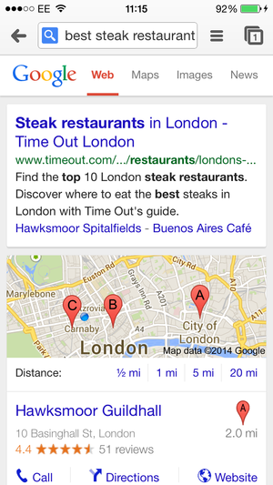 Local results tend to dominate mobile results so getting in on that action is vital to your business. This is a search for best steak restaurant on a mobile. The top result is just a short walk away.