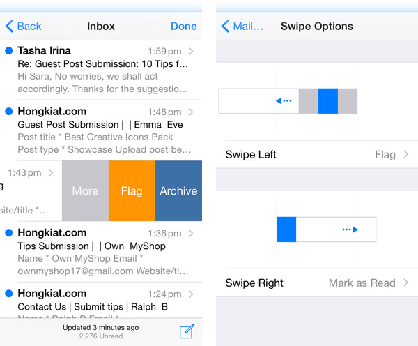 If you want to customize the swiping options further, go to Settings > Mail, Contacts, Calendars > Swipe Options.