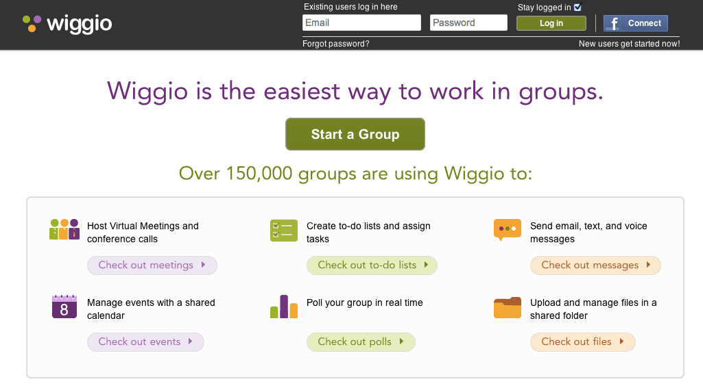 Wiggio is one of the easiest online web tools for working in groups. At the time of writing, Wiggio is being used by approximately 100,000 groups and boasts around 1.1 million users of Wiggio from around the world. These groups range from Academic Groups and Social Groups to Non-Profit and Charitable Organizations. The features offered by Wiggio include mass messaging (emails, voice mails, text messages), file sharing, scheduling, editing, conference calling, polling, project management and video conferencing. Wiggio is really useful for groups of students who are working on a semester project.