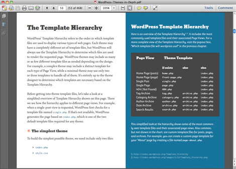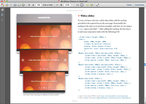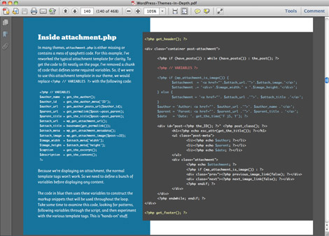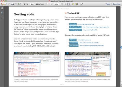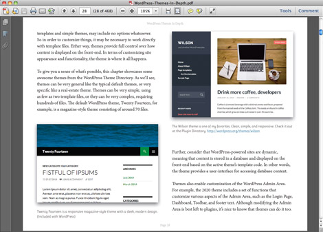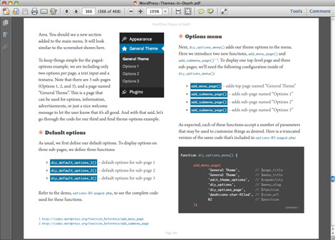 As explained over at Digging Into WordPress, WordPress Themes In Depth contains over 450 pages of straight-up theme-building action. Rather than repeat everything posted at and WP-Tao.com, here are some quick screenshots to give you an idea of what’s inside: