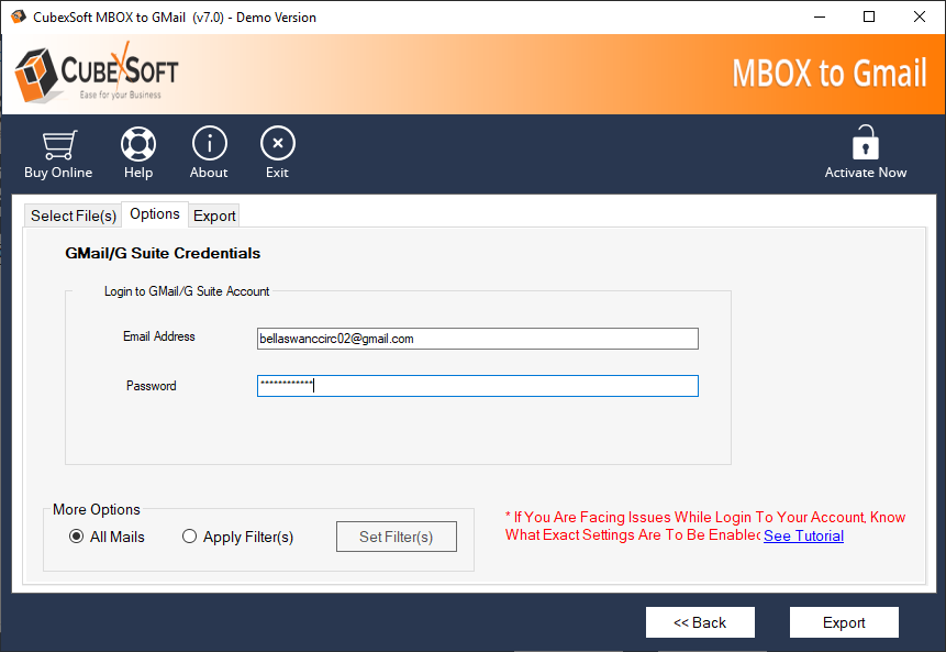 Directly Convert MBOX Mailboxes into Gmail: both software’s is an advanced utility that gives the facility to directly export all MBOX files to Gmail account within single time processing. It will only ask for the credential login details of the Gmail account to perform the direct export/import process.