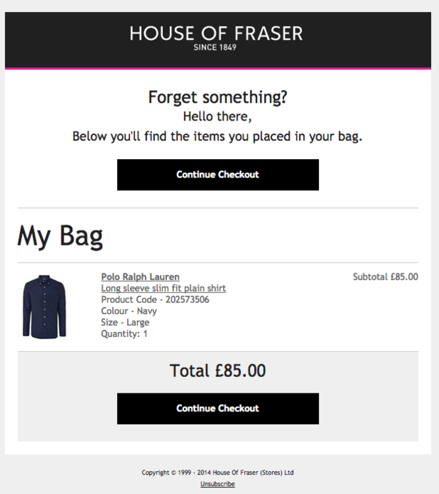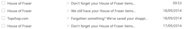 Following this initial email there were two more from House of Fraser, sent every working day since abandonment.