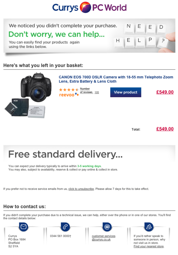 The benefit of free standard delivery is highlighted in the email, as is the price. There’s also a message at the bottom saying that if you didn’t complete your purchase due to a technical issue they can help with links to its various customer service channels.