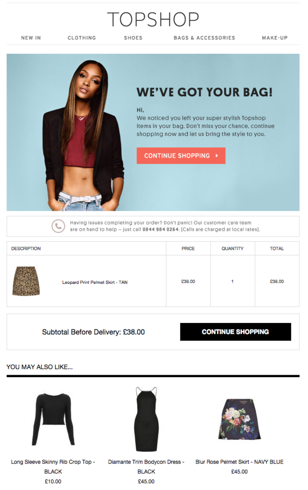 Great call-to-action buttons, good use of space, my abandoned products are listed with prices and subtotal and I quite enjoyed the copy ‘we’ve noticed you’ve left your super stylish items in your bag’ with a touch of urgency ‘don’t miss your chance’.