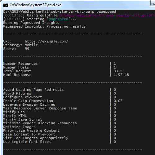 gulp pagespeed is another useful command. This command will show the pages performance scores of your application as per the Google-owned PageSpeed API. It’s a handy tool to get insight to your pages load perfomance.