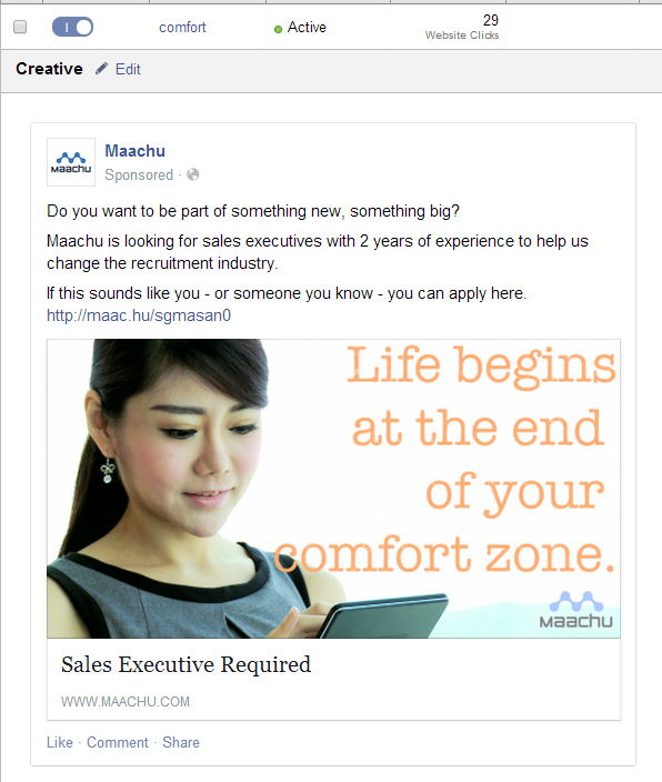 The next attempt was an ad for an ambitious salesperson. Again, perfect for one of those inspirational slogans that tend to be shared on Facebook.