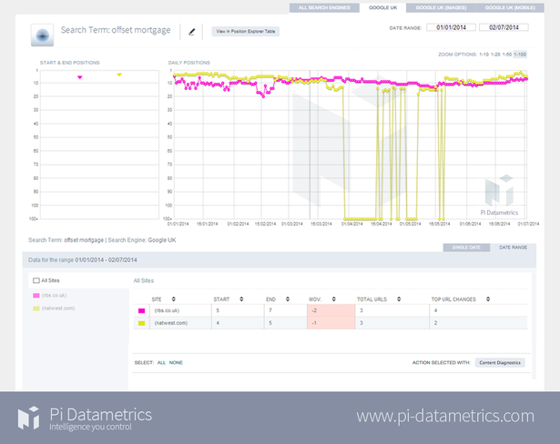 Here, for the term ‘offset mortgage’ both sites are ranking most of the time, aside from a period in April and May when Natwest’s rankings dipped below 100 on several occasions.