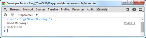 We can interact with the browser Console through the Console itself and by adding JavaScript within the document. As an example, here we tell the Console to output “Good Morning!” by typing console.log()