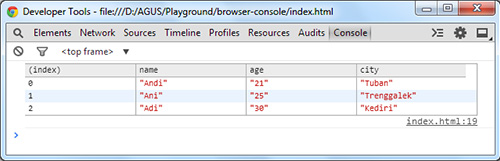var data = [ { name: "Andi", age: "21", city: "Tuban" }, { name: "Ani", age: "25", city: "Trenggalek" }, { name: "Adi", age: "30", city: "Kediri" } ]; console.table(data);
