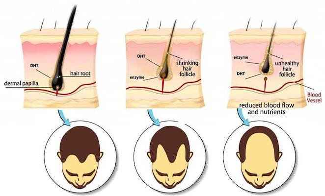 Male pattern baldness is caused by DHT (Dihydrotestosterone) that is an androgen sex hormone.