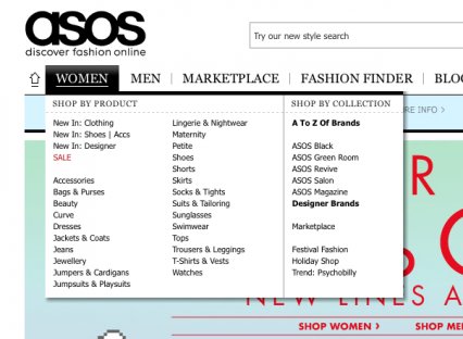 ASOS has retained the same basic layout though it has been expanded to include new ranges such as ‘Boutique’ and ‘Preowned’.