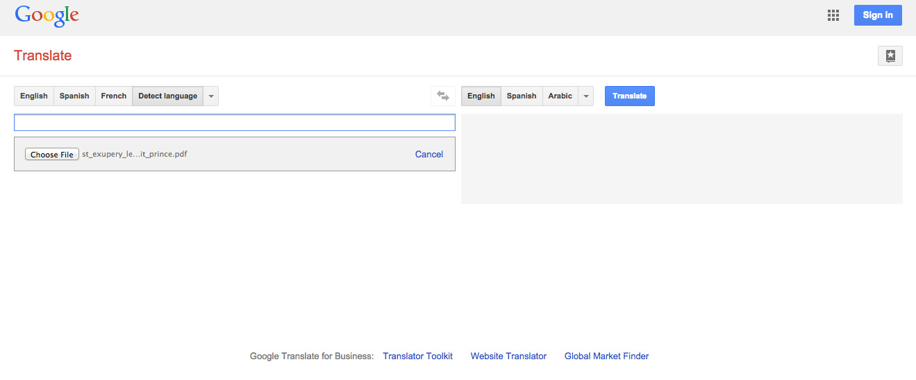 Once you’ve got the page opened, upload the PDF file using the browse button. Then, choose the language you want to translate your document into and click the blue translate button on the right side of the page. Just like that, you now have a translated document.