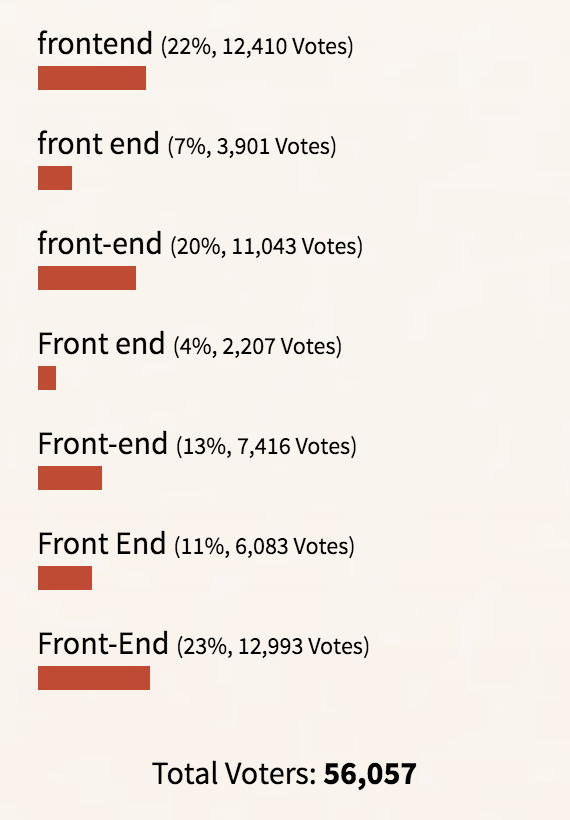 Technical Technology Technology Trends Poll Results: “front-end” and “front end” The latest poll around here kicked off asking how you prefer spell this job we all do around here: frontend? front end? Front-End? I asked because 1) I didn’t know if there was a “right” answer 2) Even if there is a right answer, it doesn’t seem adhered to. Right now on the job board: […] Written by Vipspatel Saving Bookmark this article Bookmarked
