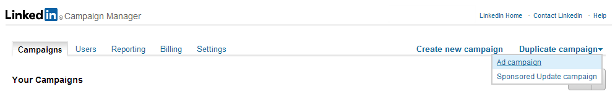 So, after you click on ‘Duplicate Campaign’, you’re presented with an option to duplicate an ‘Ad Campaign’ or a ‘Sponsored Update Campaign’.